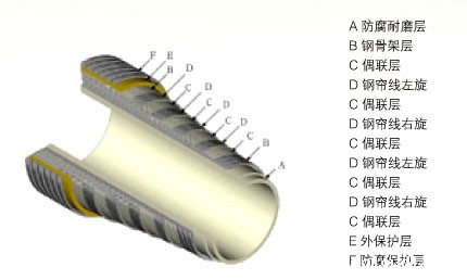 由钢骨螺旋架层为增强相,钢丝编织层为增强层,进口高密度聚乙烯为基体,在挤出生产线上成型为多层复合结构的新型防腐耐磨压力管道。